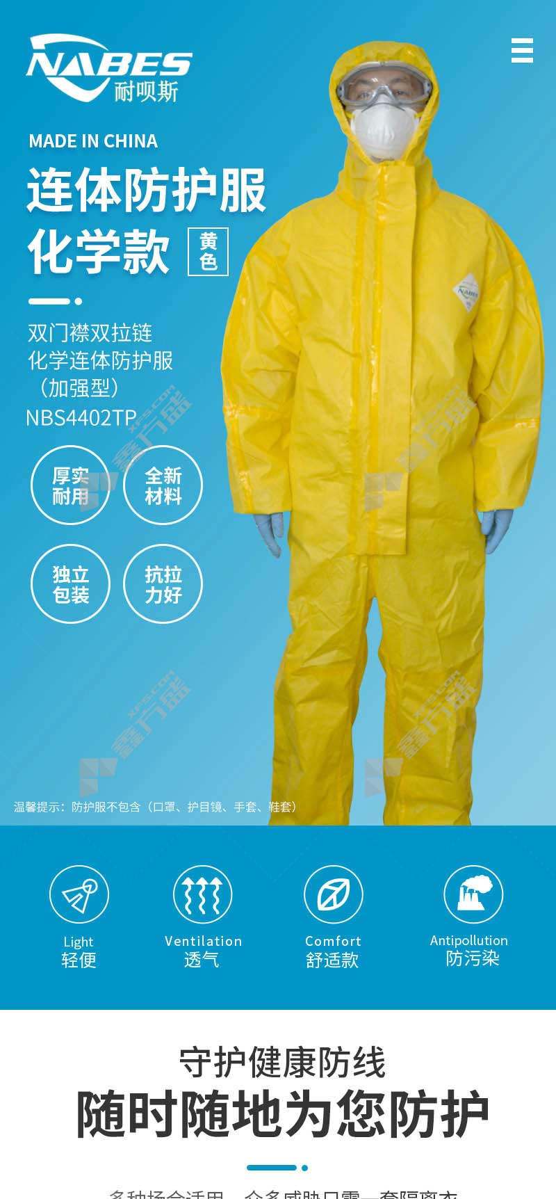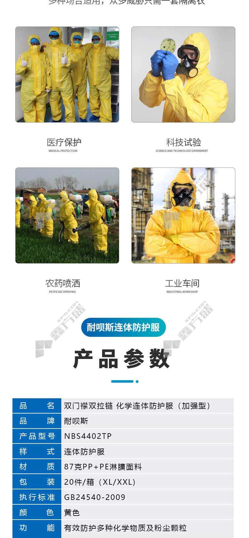 商品名称: 耐呗斯 NBS4402TP 双拉链化学连体加强型防护服 XL 黄色 NBS4402TP